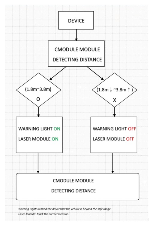 After reviewing customer’s inquiry, IADIY engineering team propose a smart plan – integrating laser range finder module and line laser module with customized pcba. While truck move into parkway, laser beam will be reflected back to sensor. These signals will be calculated by using TOF algorithm “https://en.wikipedia.org/wiki/Time_of_flight”, then IADIY laser range finder module output precise detecting distance info to microprocessor at customized board. According to customer settings, microprocessor will submit positive signal to light up laser and initiate buzzer to inform truck drivers. Receiving bright laser alarm and loud warning message, drivers will understand they may miss the correct parking spot. Since there is no other way to turn off these annoying alarm, trucks will be shifted to right location. That improves parking traffic and also operation efficiency.
