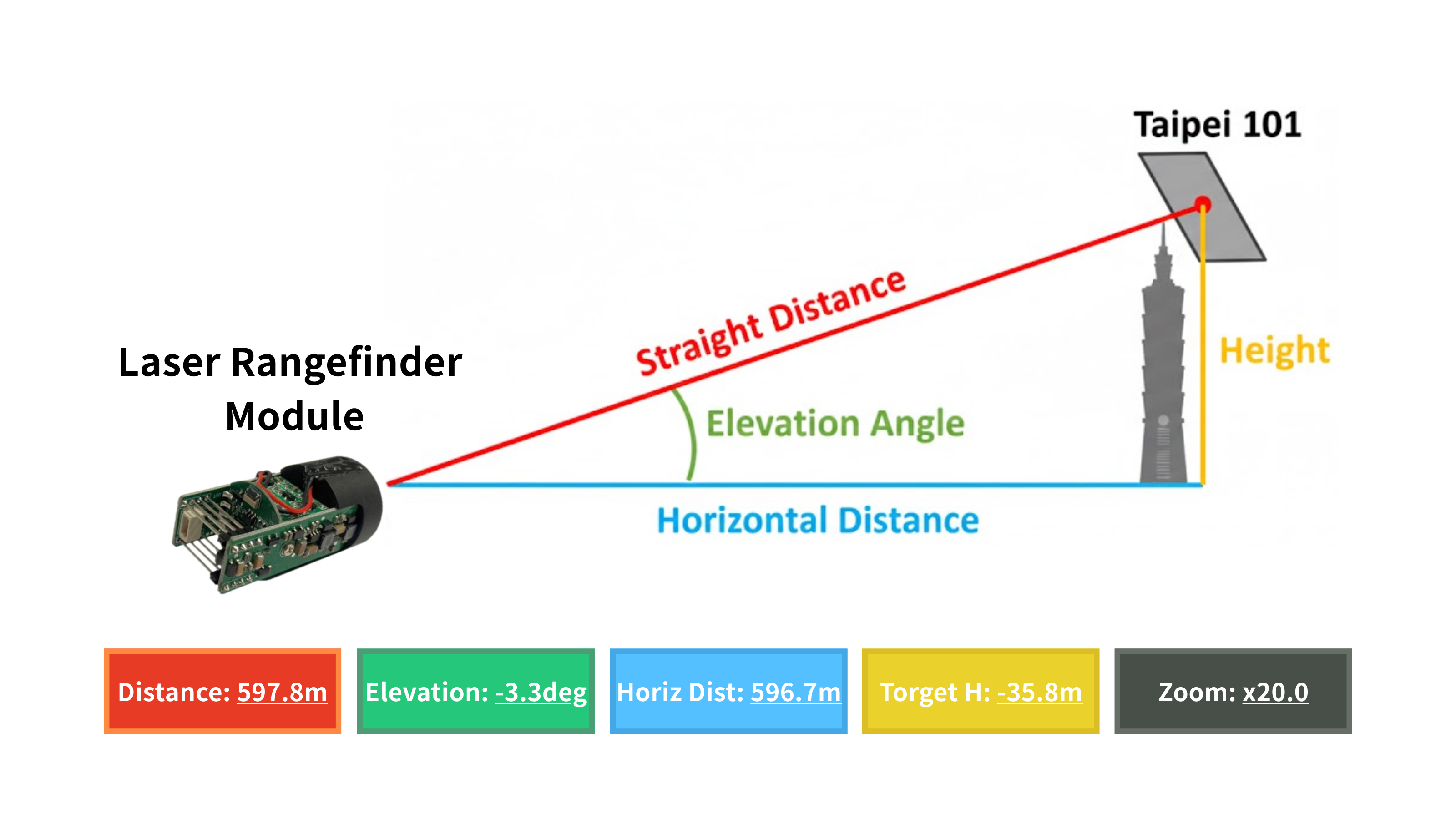 - Laser Rangefinder Module: slant distance plus angle sensing, enabling calculation of horizontal distance and target height