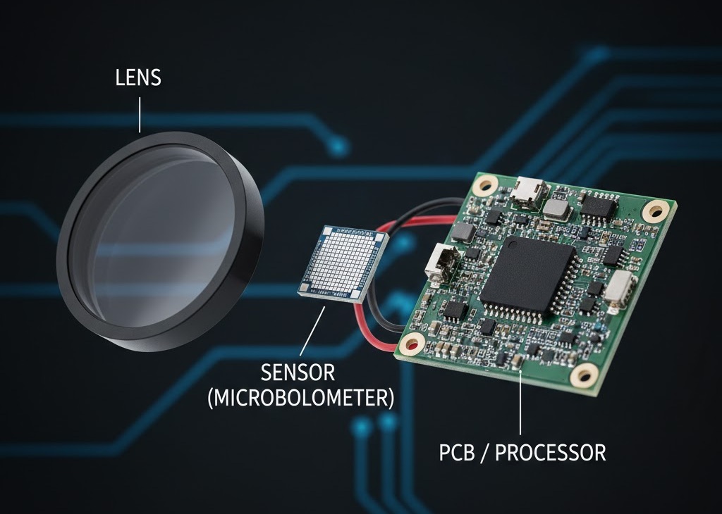 A thermal camera module packages three critical subsystems into a single, integration-ready unit: