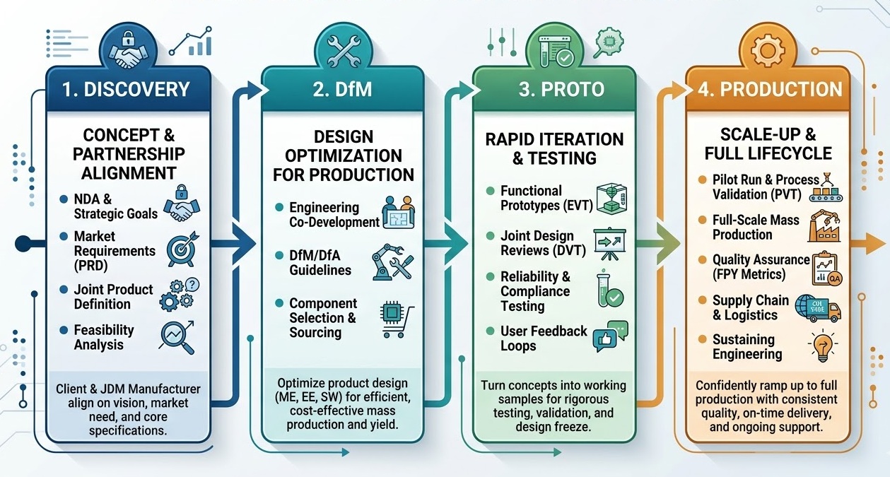 - Discovery and Feasibility: We start by understanding your functional requirements: what does your product need to do, in what environment, at what volume, and by when? This alignment phase is where we identify whether JDM is the right fit and begin mapping your requirements to available optoelectronic building blocks.